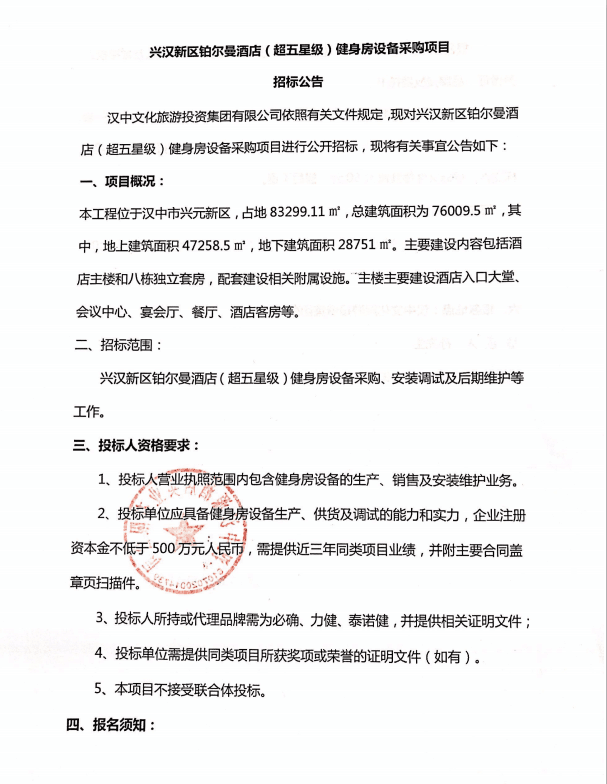 漢中文化旅游投資集團有限公司依照有關(guān)文件規(guī)定,現(xiàn)對興漢新區(qū)鉑爾曼酒店(超五星級)健身房設(shè)備采購項目進行公開招標(biāo),現(xiàn)將有關(guān)事宜公告如下: