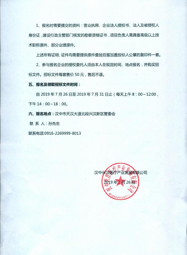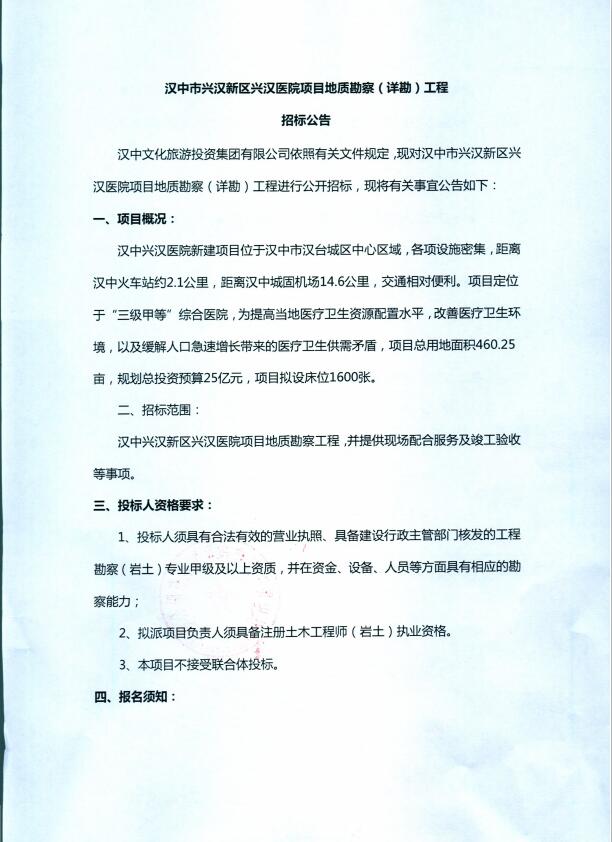漢中文化旅游投資集團有限公司依照有關文件規定,現對漢中市興漢新區興漢醫院項目地質勘察(詳勘)工程進行公開招標,現將有關事宜公告如下: