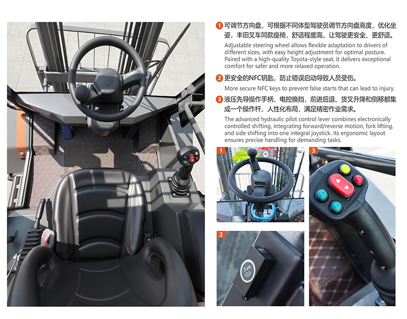 加大型豪華駕駛室,密封性好、空間更大、視野更好,為操作者提供舒適的駕乘環(huán)境,作業(yè)更安靜舒適;人性化設(shè)計(jì)的觸手可及的操作元件和按鈕,可輕松方便的實(shí)現(xiàn)各種操作動(dòng)作。大功率自動(dòng)冷暖空調(diào),立體環(huán)繞送風(fēng),可旋轉(zhuǎn)的懸浮減震座椅,大大提高了工作效率。